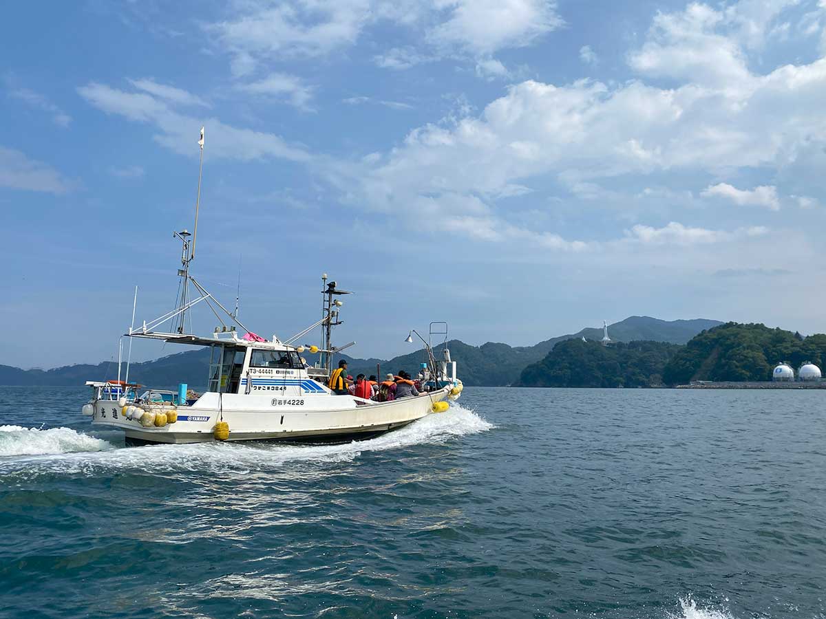 箱崎白浜は、根浜海岸からさらに半島の先にある市街地から離れた小さな漁村です。この箱崎白浜漁港からの発着プランでは、地元の漁師船で美しい海に繰り出し、ホタテやわかめの養殖場や地元漁師が安全・大漁を祈願する明神神社などの漁村部ならではの景色を楽しむことができます。