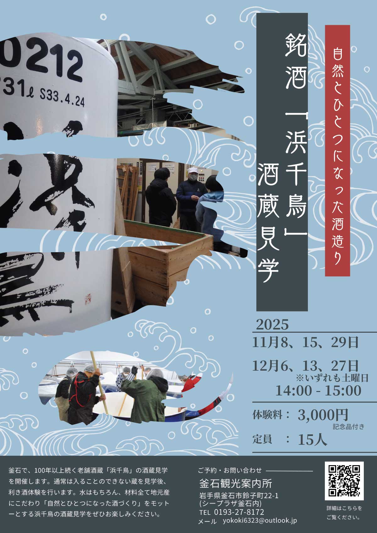 下記日程で銘酒「浜千鳥」酒蔵見学を開催します。当日は、酒蔵見学と利き酒体験で皆様をおもてなしします。また、秋から冬にかけて仕込みの時期なので、タイミングが合えば仕込み体験ができるかもしれません。