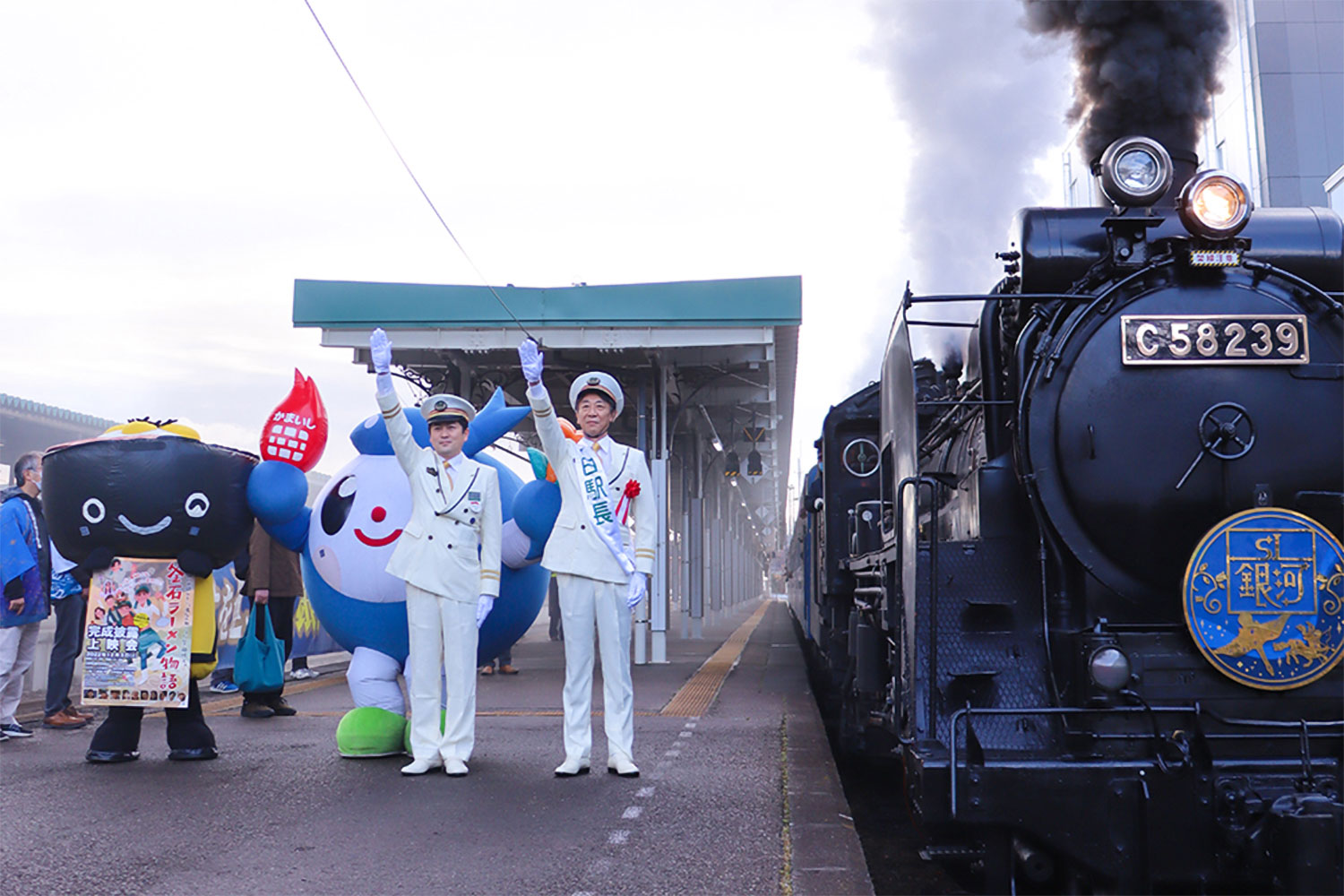 翌日4日はSL銀河の今シーズン最終運行と言うことで、お父さん役の利重剛さんに1日駅長をお願いし、SL出発の合図をお願いしました。